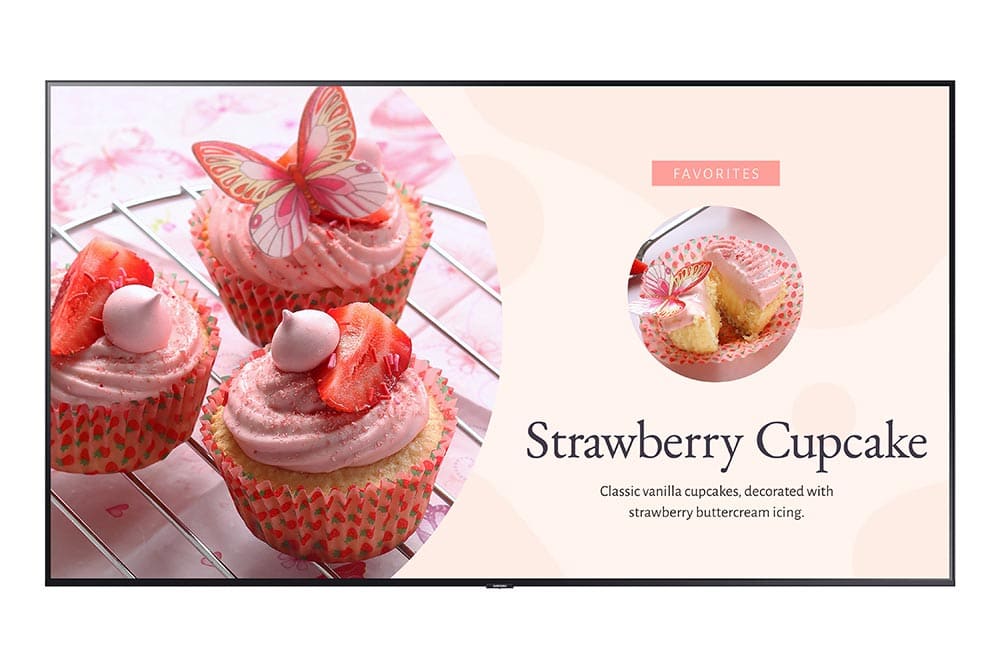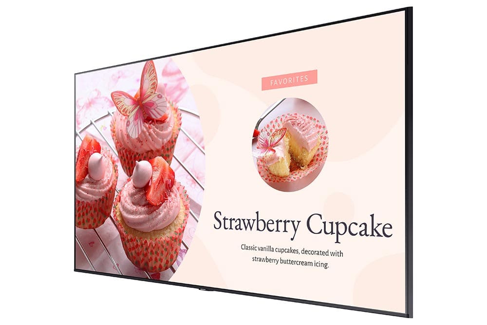 Cuente la historia de su negocio a través de mensajes visuales de alto impacto. Las pantallas digitales de gran formato de Samsung brindan calidad de imagen de nivel profesional con una relación de contraste superior y el mejor brillo y uniformidad de color de la industria.